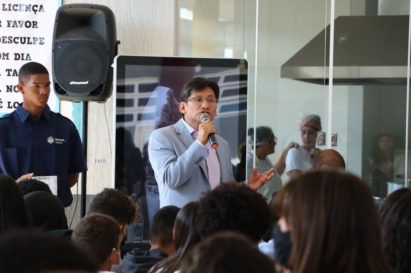 O coordenador do projeto, professor doutor Carlos Enrique Carrasco Gutierrez, apresenta os objetivos e impactos do EDUCA.CONECTA à comunidade escolar. (Crédito: Acervo do projeto EDUCA.CONECTA)